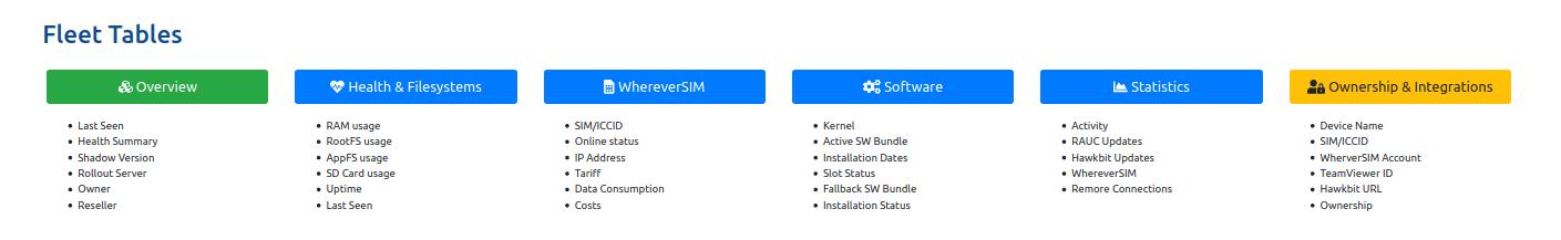 Here we set the buttons to access the fleet tables. below every button, we listed the most important elements you will find in the table.